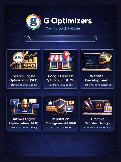 With 8 years of experience and over 5000+ satisfied clients, G Optimizers is a trusted leader in the digital space. We specialize in Search Engine Optimization (SEO), Google Business Optimization (GMB), and Website Development, helping businesses rank higher on Google, generate local leads, and build fast, modern websites.